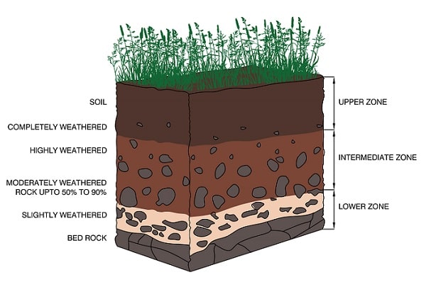 In the weathering process, there is a gradual shift from rock to soil, making it difficult to determine the exact transition from stone to soil. The typical profile of residual soil consists of three zones:
